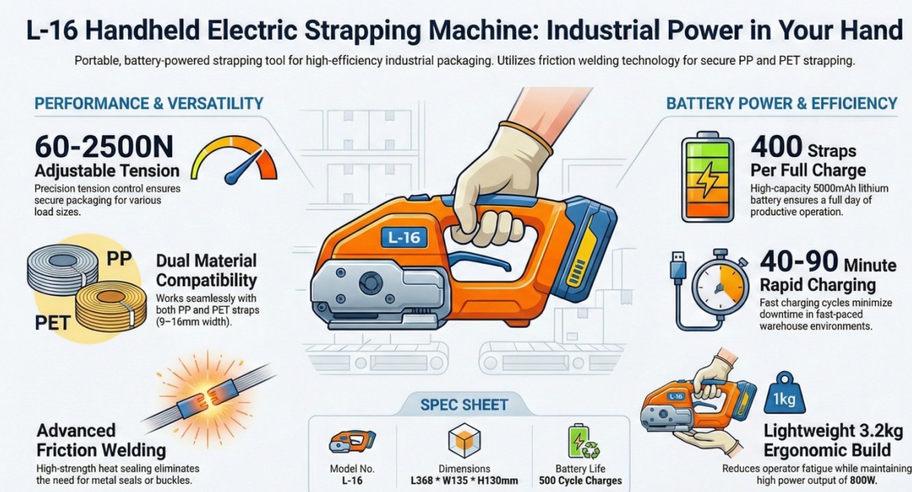 Portable handheld electric strapping tool with friction welding, adjustable tension 60–2500N, compatible with 9–16mm PP & PET straps. Lightweight, efficient and ideal for express, warehouse and logistics packing.